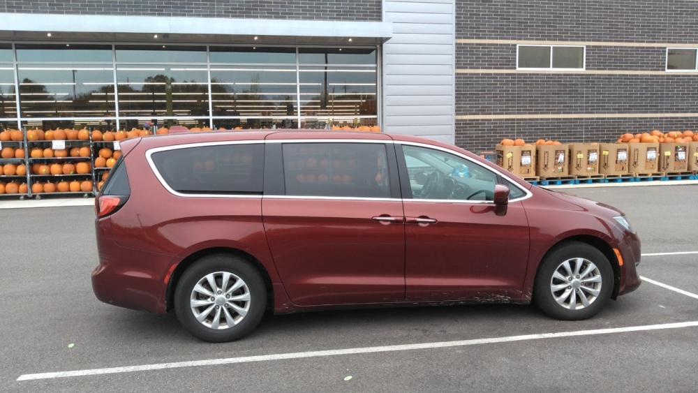 Nice outlining of pros and cons, as well as the summary. Yes to the Pentastar V6. And it has taken me a very long time to warm up to Mopar and this engine sure has helped. The other thing that the Pacifica does in terms of styling - that most other similar vehicles don't do - is that it cants the rearmost window back from the C-pillar, whereas almost all car design taper it toward the rear. While this is a stretch, it's analogous to what the last Olds Alero did with the rear passenger window in its coupe, and was successful with it. Same goes for the Pacifica. Here's one I spotted in October (the 14th), as indicated by the plethora of pumpkins behind the vehicle in the supermarket parking lot. The treatment of the rear side window at the C-pillar can be seen here. -