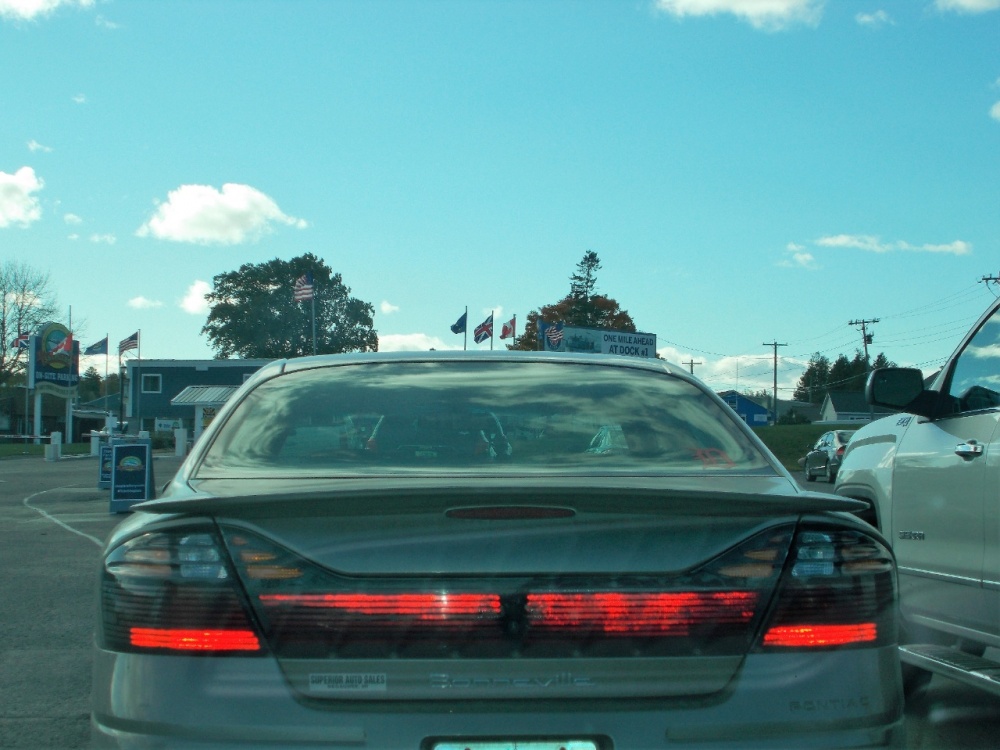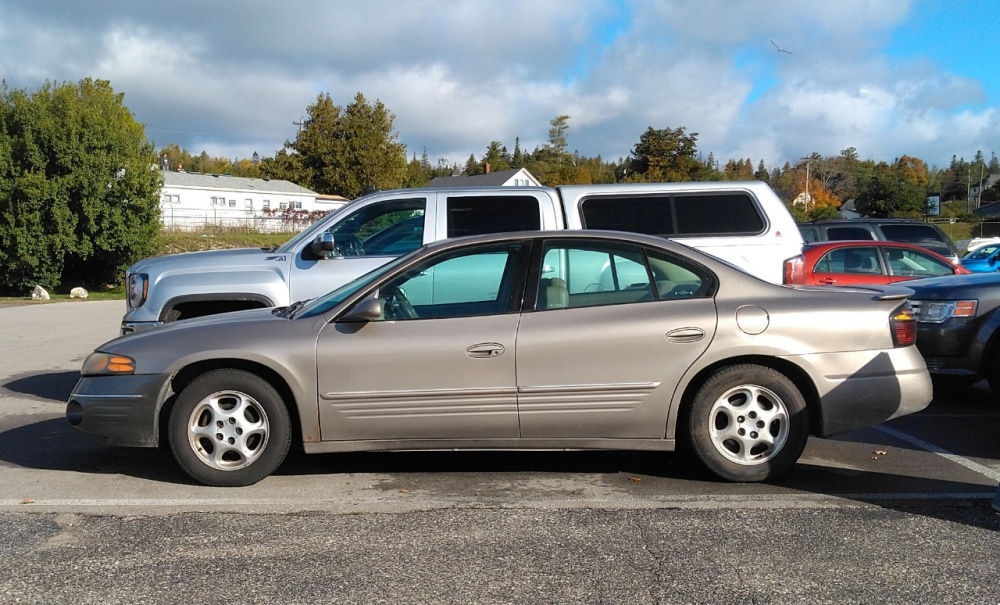 You make no sense and I don't get the humor. I can't possibly remember the old vehicles from "The Godfather" except that the "cannoli car" was big, American, bulbous, and about that color. - - - - - Spotted on October 7 near the Straits of Mackinac Bridge, a wonderful area. I did it again ... you know, some interior photos. I've got a soft spot for the Bonnes, given that I was invited to a car clinic where I got to drive one on a test track with pylons when newly released. I was surprised I liked it as much as I did and that it handled nimbly for its size. I can't tell the years on these Bonnes. Most of the ones I see seem to be this color, silver, or white. This one has too much ribbed side cladding. I think the automatic lamps in my vehicle light up the rear light bar on the Bonne since it was late in the afternoon Busy interior and dashboard and Pontiac sure liked to put circular vents and gauges anywhere they could. That extra pod with climate control vents scabbed on to the right of the center stack has always looked weird but, otherwise, the dash is cool. This interior is super comfortable and supportive, I'm sure. This is the only car I can think of where the seat belts were anchored to the seat, and not to a pillar or structure that is not part of the seat. I wonder why that was discontinued and how well that worked, but I've always thought it was an interesting set-up. And I also like the perforated headrests, which were also found in Grand Prixs during that span of years.
