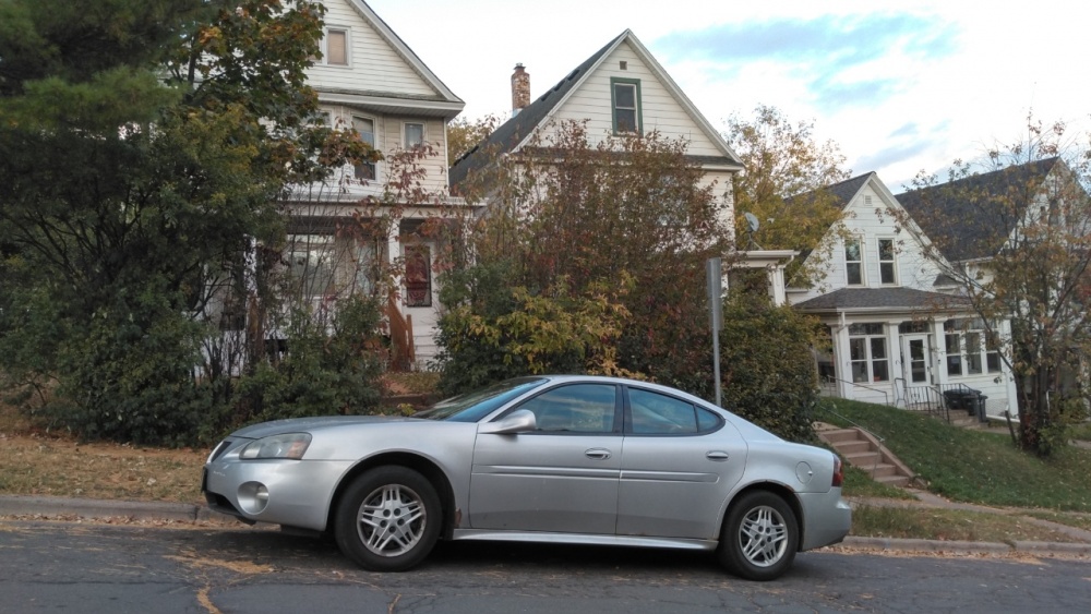 October 3 - more conventional cars seen: Blast from the past - I believe it was an '85, per the grille - in very good condition - could do without the pimpy coach light and metal decoration in the B-pillar This was about 4 houses away from the Cutlass! Just a minute or so away. Wow. Again, these look sharp in silver with burgundy leather inside. Who said we don't need coupes anymore? A GP in great condition considering where it was - a 2004 because of those wheel colors and a keyed trunk lock - all that was missing here was Mary Tyler Moore (just kidding ... RIP MTM, a cool lady). Last but not least, the Chrysler product - a Ram truck. Granted, their grilles have gotten nicer. Within the last few years, it has finally sunken in that it's not a Dodge Ram, but a Ram. What struck me here is that this dude, or chick, can keep their truck in perfect condition but not pop for a needed window pane for their garage door in a cold climate.