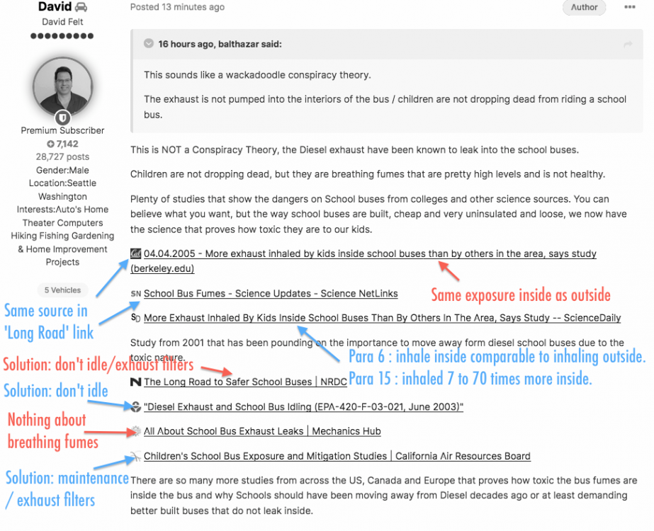 8. Per the one article, maintenance prevents emissions from exiting the exhaust system before the terminus of said system, putting it to the extreme rear of the vehicle vs. possibly leaking inside. But the consensus seemed to be about idling, not so much driving. Multiple links stated the focus was particulate matter and how filters significantly reduced that. So; room for significant improvement within the current system, not that it was at it’s zenith. I was amazed to read one reference to a bus in service from 1975. Most of what I’ve read about the busing industry stated school districts have strict ‘term limits’ on active bus life. I never rode on anything close to a 45-yr old bus going to school. I don’t think I was even on a 15-yr old bus. Of course they are, but there the surrounding atmosphere isn’t already contaminated with numerous other ‘urban’ emission sources. IE; in cities it’s certainly not only buses causing emissions, and in rural areas the air quality inside IC buses is probably significantly better.