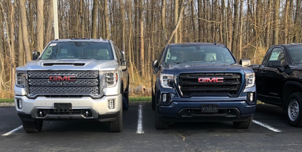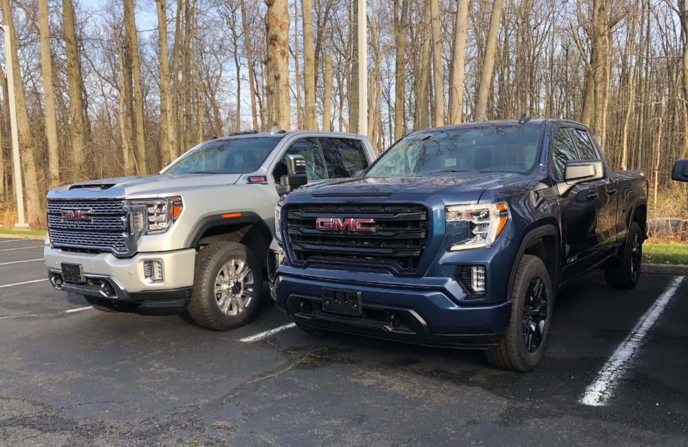 Brand new Sierra Denali 3500HD Duramax 6.6L/ Allison 10-spd on the left. Sticker was $83K. That’s my desired Pacific Blue Elevation on the right, except it was a 2.7L Double cab. Purty in person tho.