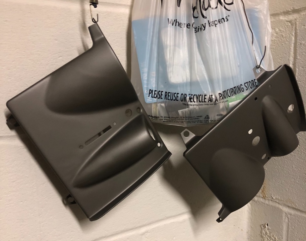 Painted speedo hood and 2 lower dash panels that house a variety of controls. Trying to figure out a modification to a tissue dispenser to have the face hinge down / hide a trio of aftermarket gauges. Also polished up a cool ‘V’ emblem from a B-58 for the package shelf, and am exhausting a few last techniques RE trying to save the dash chrome vs. re-chroming. None of them are going to be an acceptable alternative to the real thing unfortunately.