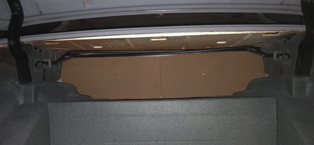 Here’s the ‘fiberboard’ panels that hides the back of the rear seat, installed: Cleaned up & started priming the trans mount ‘offset’ plate for paint :