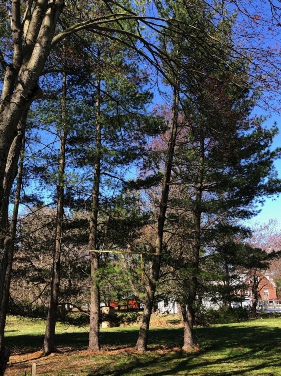 These are the neighbor's white pines. The ground stays wet often right where they are, and white pines have poor root structure; in wet ground with strong winds they go over. This is the latest one to start flirting with the ground from afar. I put a car ratchet strap on it - it's rated to 10,000 lbs so it should hold. But the tree has to go; now to get the neighbor to pay for it. For a sense of scale, I'd say that yellow strap is about 14' in the air.