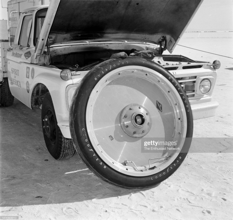 Wheel off the Spirit of America LSR car ~ For reference; per the dually Ford behind it, the Ford should be on 20" rims.