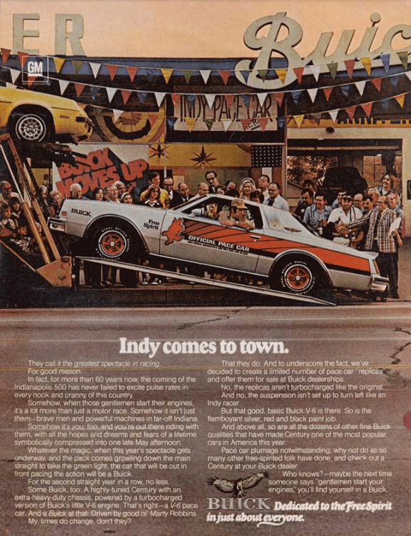 You did; you said you were 46 and 'it was gone before I appeared.' 2018-46=1972, therefore claiming it lasted no longer than 1971, but the 455 CI GS went thru 1975. 4 years is half a decade (minus 1). The next engine you mention after "the 455 went away" was the 231. But the predominant engine was the SBB 350. I'd have to check if the 231 was even offered in this body; IDK so I'll make no claim. While not as exciting as the 455 CI variants, Buick did pace the Indy 500 in '76 with the turbocharged 231, and it was publicized heavily. It was Buick that drove the now dominant forced induction ICE. There was a short lapse - the production turbo didn't come out until '78, then came the T-type, then the GN, and of course the GNX at the end of the platform. That's a 10 year run there. GS's ran '65-75, or 11 years. 21 years out of 23 with dedicated performance-oriented Buicks. I can't fault that track record. Performance was hot and Buick provided to their customers. BTW- Buick also paced Indy in '75, with a 455 CI GS ~ By 12 months. It was the 3rd person in the door at the house party, which would take over the entire block in a few more years (An AMC pony car???). -