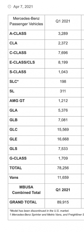 The GLS outsells the GLB, and almost outsold the C-class, but I think the C-class was maybe down to a new model coming, or maybe just no one buys sedans anymore too. You also realize C-class and GLC are priced the same as a Lexus RX or Cadillac XT5, which are the best sellers for the competition. And I looked at my local dealer, they have about 10 or so GLB250's all around $47-49k, the C300s and GLC300s are around 50 to low 50s and obviously the AMG's are more but that is low volume. Mercedes can't be akin to General Motors because Mercedes is 1 brand. GM since its inception has been a group car car companies/brands.