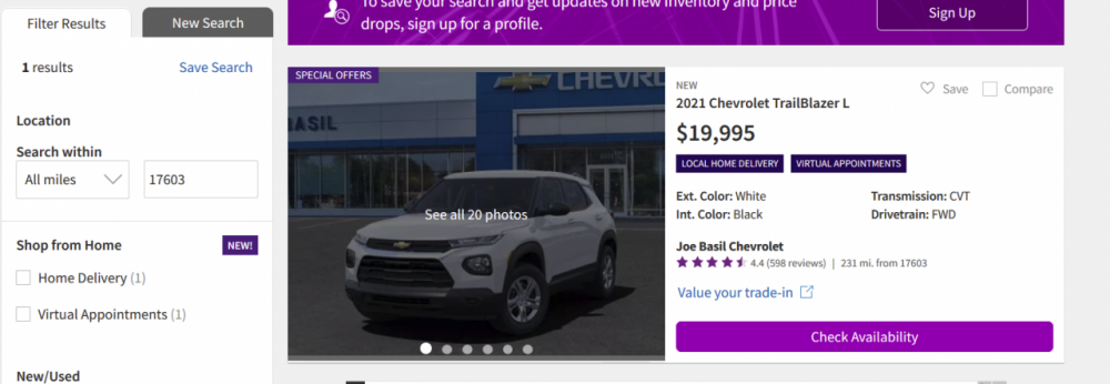 https://www.cars.com/for-sale/searchresults.action/?mdId=36723428&mkId=20064&page=1&perPage=50&rd=99999&searchSource=GN_REFINEMENT&sort=relevance&stkTypId=28880&trId=24929&zc=17603 410 results with the same criteria used to search for Trailblazer L. Save for the vapor, loss leader Trailblazer L that no one will be able to actually buy in quantity, the Trailblazer and Kona are way more closely matched in size and price than the Chevy is to the Venue. The Venue occupies a space a tick below the Trailblazer in size and price and tops out in the $23k range, where the Kona and Trailblazer each have top trims in the $31k range.- 77 replies