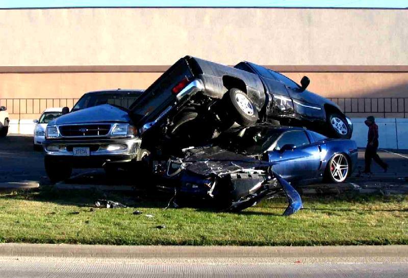Looking at the photo, my best guess is that the truck on top (sure does look like a Sierra with those 6 bolt wheeks) was originally parked next to the F-100 before the Z06 attempted to drive under it.