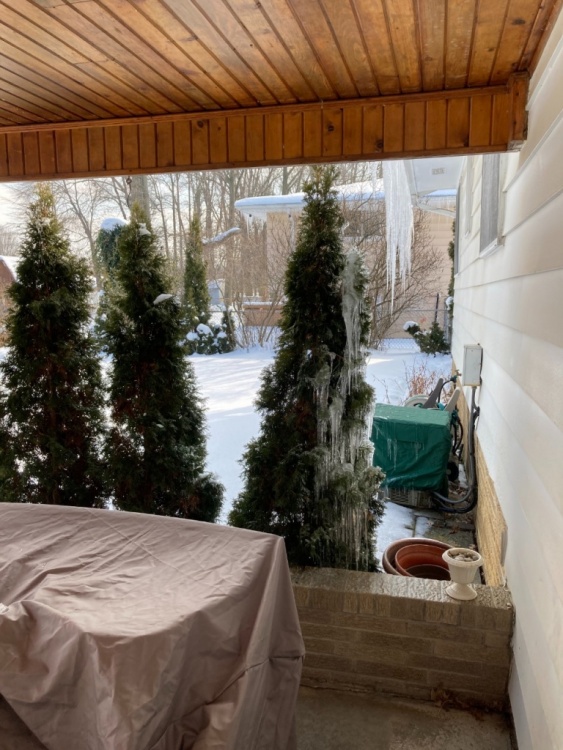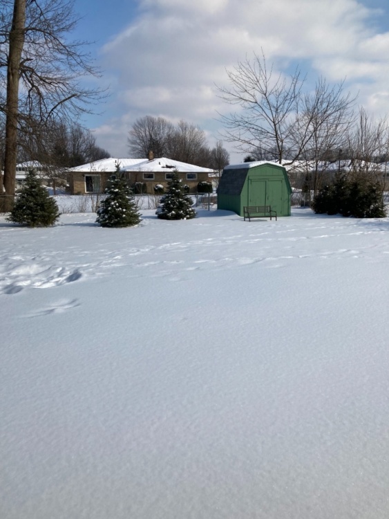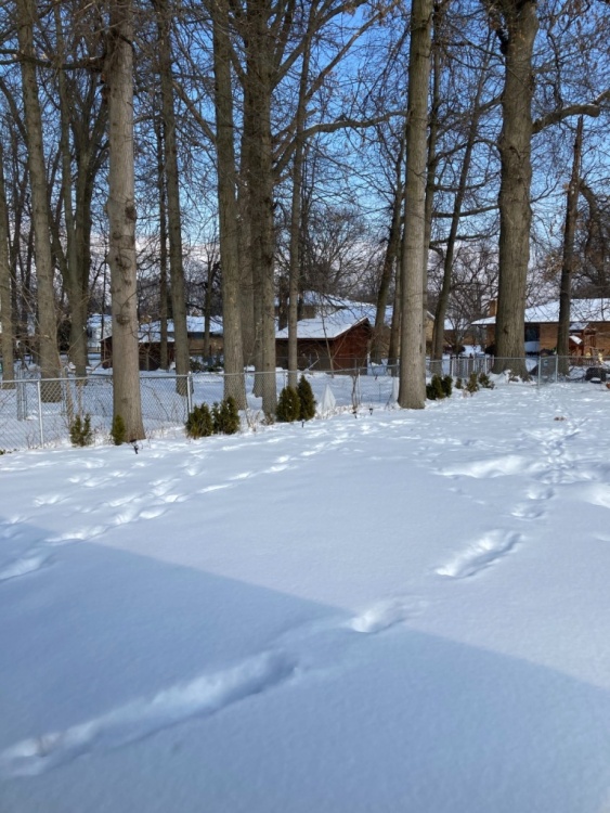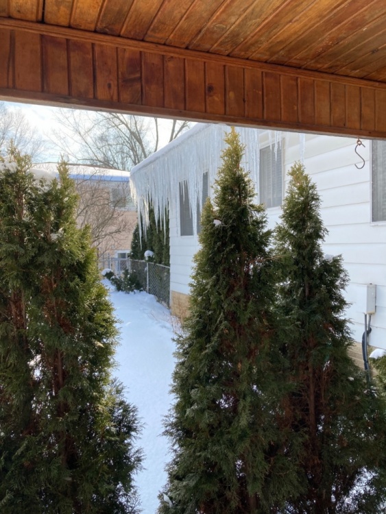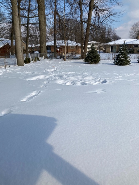 Sunny and 25 out... supposed to get to 36 tomorrow, then more snow Mon-Tues. Giant icicles hanging off the gutters, and even on one of the trees....tracks of the deer, the dogs and other critters that have been in the back yard over the last week of snow storms. Looking forward to March..