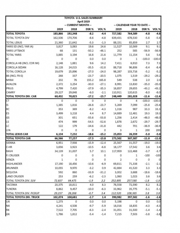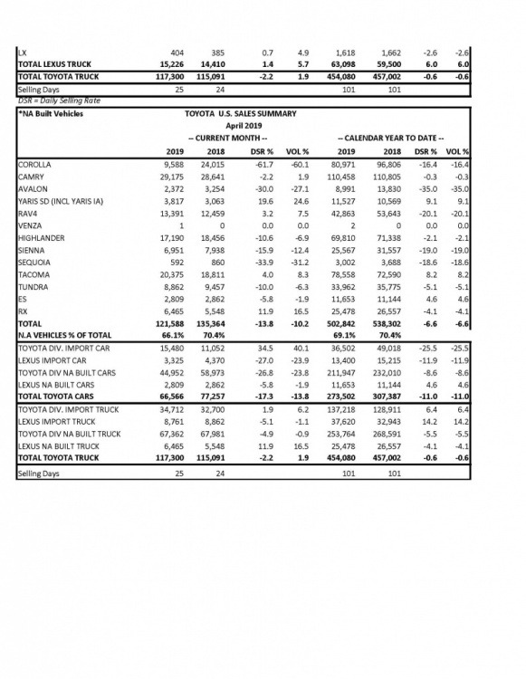 Toyota Motor North America Reports April 2019 Sales RAV4 sales up 10.1 percent; a best-ever April Tacoma up 8.3 percent; a best-ever April and the 18th consecutive month of increased sales Corolla Hatchback sales increased 14.2 percent; a best-ever April NXh sales up 13.0 percent; a best-ever April and the 19th consecutive best-ever month PLANO, Texas (May 1, 2019) – Toyota Motor North America (TMNA) today reported April 2019 sales of 183,866 vehicles, a decrease of 4.4 percent on a volume basis and a decrease of 8.2 percent on a daily selling rate (DSR) basis versus April 2018. Toyota division posted April sales of 162,506 units, down 4.8 percent on a volume basis and down 8.6 percent on a DSR basis. Lexus division posted April sales of 21,360 vehicles, down 1.3 percent on a volume basis and down 5.3 percent on a DSR basis. April 2019 Highlights Tacoma up 8.3 percent; a best-ever April, with 18 consecutive months of increased sales Toyota light trucks marked a best-ever April, with 102,074 in sales RAV4 sales up of 10.1 percent; a best-ever April Corolla Hatchback sales increased 14.2 percent; a best-ever April Yaris sales up 21.6 percent Mirai sales increased 165.8 percent; a best-ever April LX sales up 4.9 percent ES sales increased by 8.7 percent NXh sales up 13.0 percent; a best-ever April and the 19th consecutive best-ever month RXh sales increased 30.4 percent Lexus Hybrid sales up 60.9 percent Note: Unless otherwise stated, all figures reflect unadjusted raw sales volume