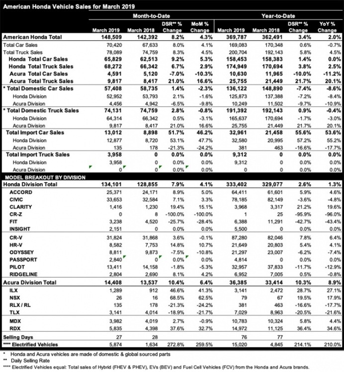 American Honda and Honda Brand Set March Sales Records Fueled by Robust Car Sales; Acura Brand Continues Resurgence Apr 2, 2019 American Honda nets car, truck and overall March sales records, rising 4%, 4.5% and 4.3% respectively Honda cars gain 5.3% while trucks rise 2.9% resulting in March records for both, as well as Honda brand Honda cars sales surge with Accord gaining 5%, and Civic up 3.3% with a new March record Acura sales increase 6.4% in March as resurgence continues with 8.9% gain in first quarter of 2019 Acura RDX sets yet another monthly sales record with a 32.7% increase American Honda Total 148,509 +4.3% Cars 70,420 +4.1% Trucks 78,089 +4.5% Total 134,101 +4.1% Cars 65,829 +5.3% Trucks 68,272 +2.9% Total 14,408 +6.4% Cars 4,591 -10.3% Trucks 9,817 +16.6% Honda Sales Highlights Honda’s record March sales was led by Accord and Civic, as Honda cars were big contributors, even as trucks also set a new March record with strong sales for HR-V, CR-V and Ridgeline. Civic, the retail car sales leader through February, rose 3.3% on sales of 33,653 units for a new March record. Accord gained 5% on sales of more than 25,000 units for the month. HR-V set a March record, gaining 10.7% on sales of 8,582 units. Ridgeline sales were up 4.2% in March, on sales of 2,804 units. Electrified vehicle sales totaled 5,874, with notable gains from Insight, Clarity PHEV and Accord. Acura Sales Highlights Acura sales continued strong momentum with its best March sales in five years, rising 6.4% as the brand completed a strong first quarter. Driving the gains were ILX, up more than 40%, and RDX, which set a new March record. ILX jumped 41.3% on sales of 1,289 units, while TLX sales of 3,141 marked its best month since March 2018. RDX sales increased 32.7% in March, on the way to setting a 10th consecutive monthly record on sales of 5,835 vehicles. MDX maintained a strong pace with sales of nearly 4,000 units.