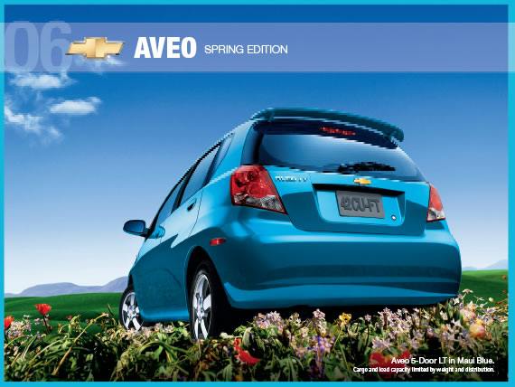 Oh, how cute The Aveo Spring Edition will include: 5-door LT in Maui Blue Power Sunroof Foglamps 6 disc CD changer/MP3 Six speaker sound system Satin chromed A/C control cover Limited release 15-inch wheels All for only $995 option That's the best Spring Edition deal going. [attachment=94:attachment]
