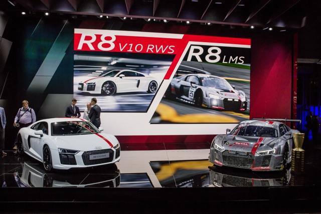 Audi is very much synonymous with quattro all-wheel drive. But what happens when you take the quattro part of one of their vehicles, like the R8. You end up with the R8 V10 RWS (Rear Wheel Series) that debuted tonight in Frankfurt. “A limited-edition special model for customers with an appreciation for essential driving enjoyment, the R8 V10 RWS is an absolutely exclusive offer. With its mid-mounted V10 engine and rear-wheel drive, it successfully brings the driving concept of our R8 LMS racing car to the streets,” said Stephan Winkelmann, CEO of Audi Sport GmbH in a statement. By removing the all-wheel drive system, Audi was able to drop 110 pounds from the coupe and 88 pounds from the spyder. The RWS sticks with the base 5.2 V10 with 540 horsepower paired with a seven-speed dual-clutch transmission. Audi says the sprint to 62 mph takes 3.7 seconds in the coupe and 3.8 seconds in the spyder (0.2 seconds slower than the quattro models). Visually, the RWS models come with a grille and airflow openings finished in matte black, a gloss back upper side blade, 19-inch wheels, and the option of a red stripe. Only 999 R8 V10 RWS models will built with pricetags of 140,000 euros (about $167,544) for the coupe and 153,000 euros (about $183,102) for the spyder. No word on whether Audi will offer the R8 RWS for the U.S. Source: Audi Press Release is on Page 2 Puristic driving dynamics: the new Audi R8 V10 RWS First Audi production model with rear wheel-drive as a limited edition 50 kilograms (110.2 lb) lighter than R8 Coupé V10 Stephan Winkelmann, Managing Director Audi Sport GmbH: “R8 V10 RWS successfully brings driving concept of our R8 LMS racing car to the streets” The Audi Sport GmbH is extending its R8 model series to include a new derivative with rear-wheel drive. The Audi R8 V10 RWS (Combined fuel consumption in l/100 km: 12.6 – 12.4, combined CO2 emissions in g/km: 286 – 283**) comes in a limited series of 999 units with both Coupé and Spyder variants. It will be rear-driven (Rear Wheel Series) and be built exclusively by hand at the Böllinger Höfe R8 factory. “The R8 V10 RWS is made for purists,” said Stephan Winkelmann, CEO of Audi Sport GmbH. “A limited-edition special model for customers with an appreciation for essential driving enjoyment, the R8 V10 RWS is an absolutely exclusive offer. With its mid-mounted V10 engine and rear-wheel drive, it successfully brings the driving concept of our R8 LMS racing car to the streets.” Matt black design elements, optional films The puristic character of the new R8 variant is underscored by the matt black grille of the Singleframe and the matt black air apertures at the front and rear of the car. The upper sideblade (of the Coupé) is finished in gloss black, the lower blade in the body color. Similar to the R8 LMS GT 4, the Coupé is available with an optional red film running over the hood, roof and rear end. Inside, the driver and passenger sit in sport seats covered in leather and Alcantara. Bucket seats are available as an option. The dashboard bears an emblem “1 of 999,” indicating the limited number of units. 5.2 FSI engine – one of the last naturally aspirated engines in its segment The mid-mounted V10 engine of the Audi R8 V10 RWS produces 397 kW (540 hp). It delivers its peak torque of 540 Nm (398.3 lb-ft) at 6,500 rpm. The 5.2 FSI engine accelerates the Coupé from 0 to 100 km/h (0 – 62.1 mph) in 3.7 seconds (Spyder: 3.8 seconds) and beyond to a top speed of 320 km/h (198.8 mph) (Spyder: 318 km/h [197.6 mph]). With the top closed, average fuel consumption of the R8 V10 RWS is 12.4 liters per 100 kilometers (19.0 US mpg), corresponding to 283 grams CO2 per kilometer (455.4 g/mi). With the top open, these figures are 12.6 liters (18.7 US mpg) and 286 grams CO2 per kilometer (460.3 g/mi). Specially tuned chassis setup allows controlled drifts The Coupé weights 1,5090 kilograms (3,505.3 lb) (without driver). 50 kilograms (110.2 lb) less than the R8 Coupé with all-wheel drive which needs additional components like propshaft, multi-plate clutch and center differential. The Spyder is 40 kilograms (88.2 lb) lighter than the R8 Spyder V10, weighing in at 1,680 kilograms (3,703.8 lb) (without driver). The axle load distribution of 40.6:59.4 (Coupé) and 40.4:59.6 (Spyder) together with chassis and handling tuning specially adapted for rear-wheel drive provide for incredibly fun driving. The chassis setup and control systems allow controlled drifts if the driver chooses “dynamic” mode in the standard Audi drive select dynamic handling system and sets the Stabilization Control ESC to “Sport”. The ESC intervenes reliably at the limit. The electromechanical power steering is completely free of torque steer and enables precise handling. The Audi R8 V10 RWS rolls standard on black-finished, 19-inch, cast aluminum wheels in a five-spoke V-design, with 245/35 tires up front and 295/35 at the rear. The Audi R8 V10 RWS will be available for order in Germany and other european countries from autumn 2017, and from the beginning of 2018 the first units will hit the streets.The Coupé starts at 140,000 euros, the Spyder at 153,000 euros.